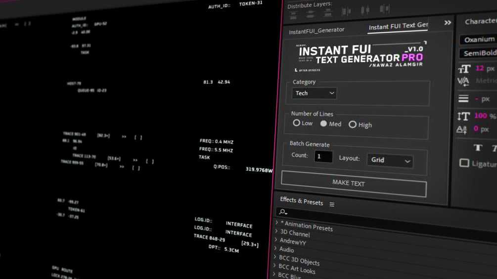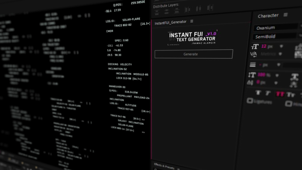 Bring your sci-fi screens and HUDs to life with authentic FUI text blocks generated instantly. Created by Nawaz Alamgir, a professional motion designer and VFX artist with credits on Jurassic World Dominion, No Time to Die, and Venom.