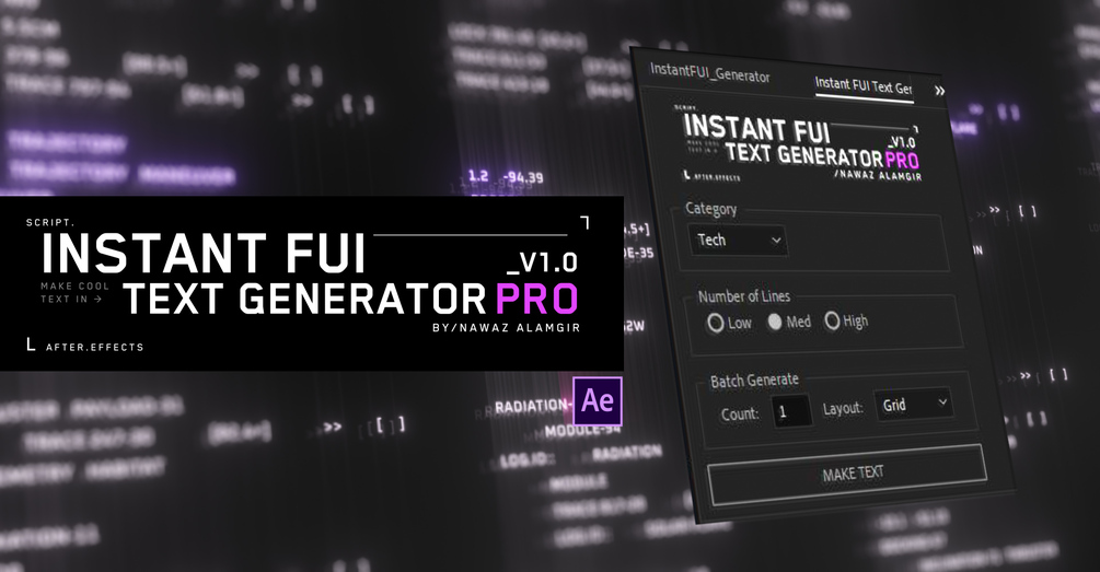 Instant FUI Text Generator Pro v1.0 is a powerful custom After Effects script that creates randomised, professionally formatted tech text blocks with a single click. It’s designed for motion designers, editors, and VFX artists who need to build authentic-looking computer readouts, data overlays, system logs, navigation coordinates, status reports, and futuristic UI text elements quickly and effortlessly.